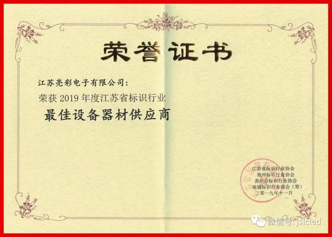 在這次盛會上,榮獲"2019年度江蘇省標(biāo)識行業(yè)最佳設(shè)備供應(yīng)商"。這是江蘇亮彩公司的光榮,感謝協(xié)會對我司的認(rèn)可,以此為今后工作更大的動力,更好地為協(xié)會和廣大客戶服務(wù)!