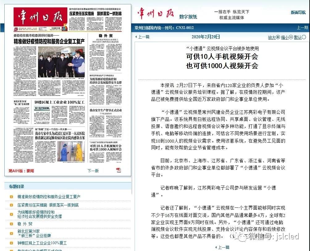 隨后進(jìn)行了座談會,大家進(jìn)行深度交流。章總對各位領(lǐng)導(dǎo)到來表示歡迎,并向領(lǐng)導(dǎo)們介紹了江蘇亮彩和利亞德戰(zhàn)略合作關(guān)系,作為利亞德集團(tuán)江蘇省級工程商、會議商顯江蘇總運營商。公司主營的版塊:智能顯示、智慧城市終端、會議商顯、夜景照明、文化旅游、AR/VR娛樂、供電系列。2020年2月29日,常州日報頭版報道了疫情期間,“江蘇亮彩”旗下“小德通”云視頻會議平臺被多地免費使用,助力企事業(yè)單位線上辦公會議,同時也加快了視頻會議替代傳統(tǒng)現(xiàn)場會議的腳步。