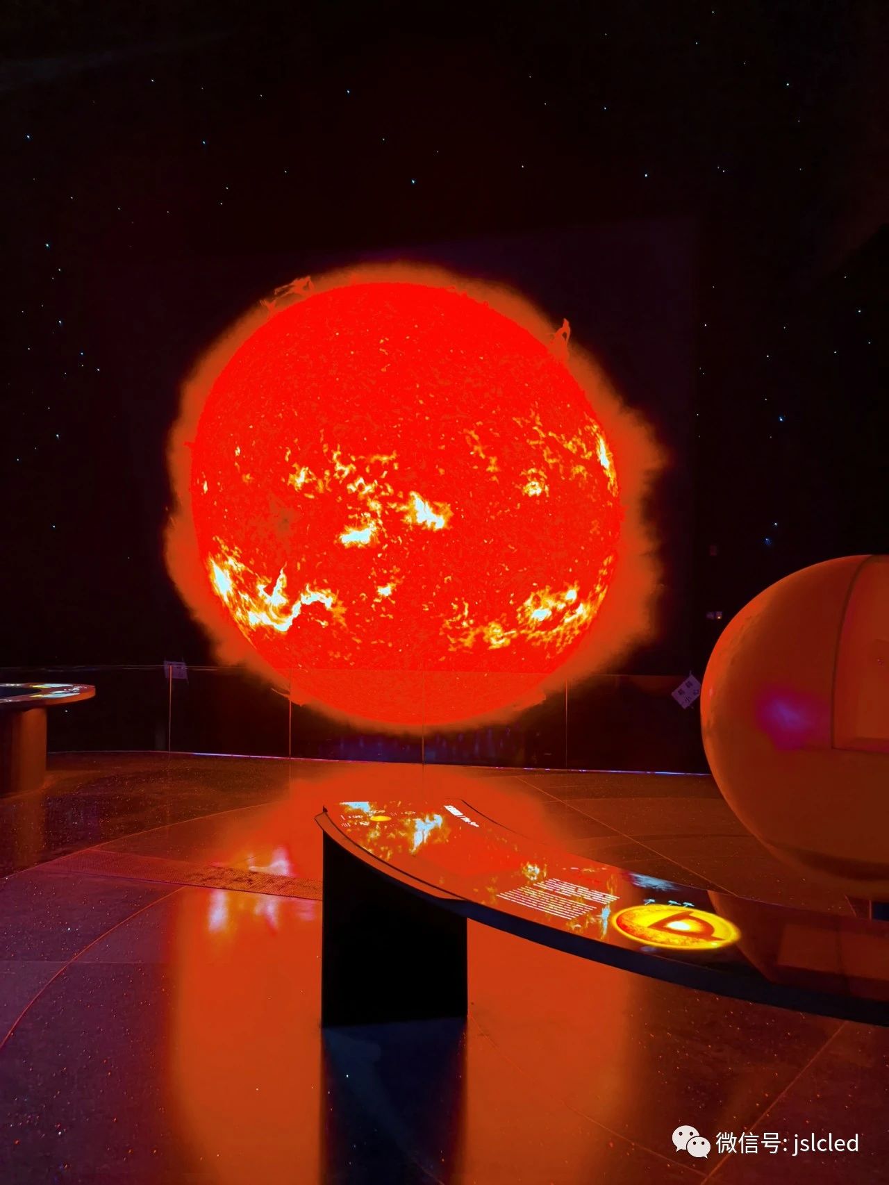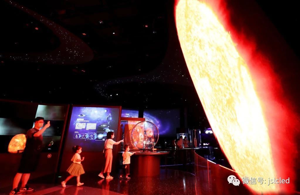江蘇亮彩憑借豐富的項目經驗及過硬的產品品質,獲得了參與上海天文館的大屏建設機會,為場館承制了兩塊LED顯示屏,分別是“家園”主題展區內太陽屏和拱形屏