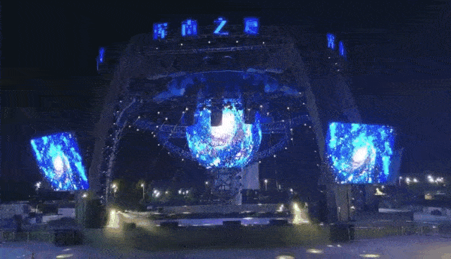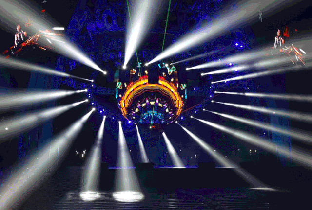 中央懸掛的高清多維球形屏幕,由512塊單體屏幕包裹而成,采用的是金立翔戶外P5間距LED屏,配合頂部的機械手裝置造型,為演出呈現(xiàn)精彩絕倫的立體特效,帶領(lǐng)觀眾穿梭時空,打造出既熱烈又炫酷的現(xiàn)場氛圍。